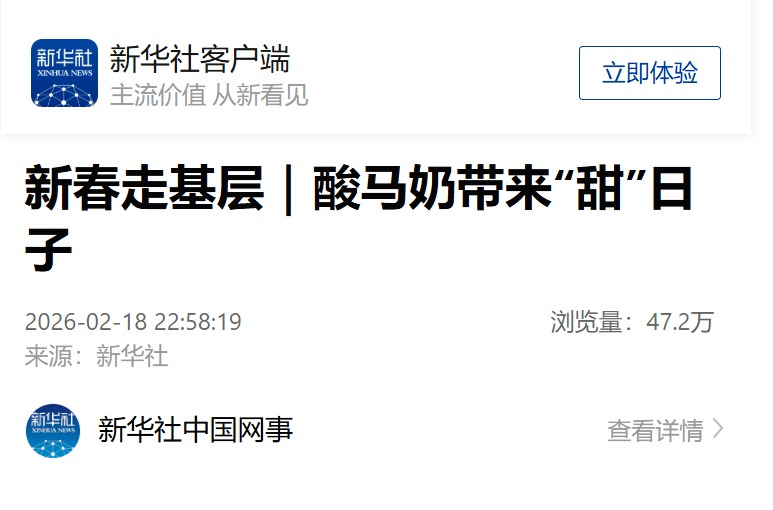 同樣在春節(jié),在新華社客戶端上,記者通過(guò)新春走基層的視角,沉浸式記錄錫林浩特市白音錫勒牧場(chǎng)牧民借助酸馬奶奮斗出來(lái)的“甜”日子,感受西烏珠穆沁旗標(biāo)準(zhǔn)化馬奶加工廠的發(fā)展變遷,深度解碼錫林郭勒盟馬產(chǎn)業(yè)“鏈?zhǔn)桨l(fā)展”新路徑。