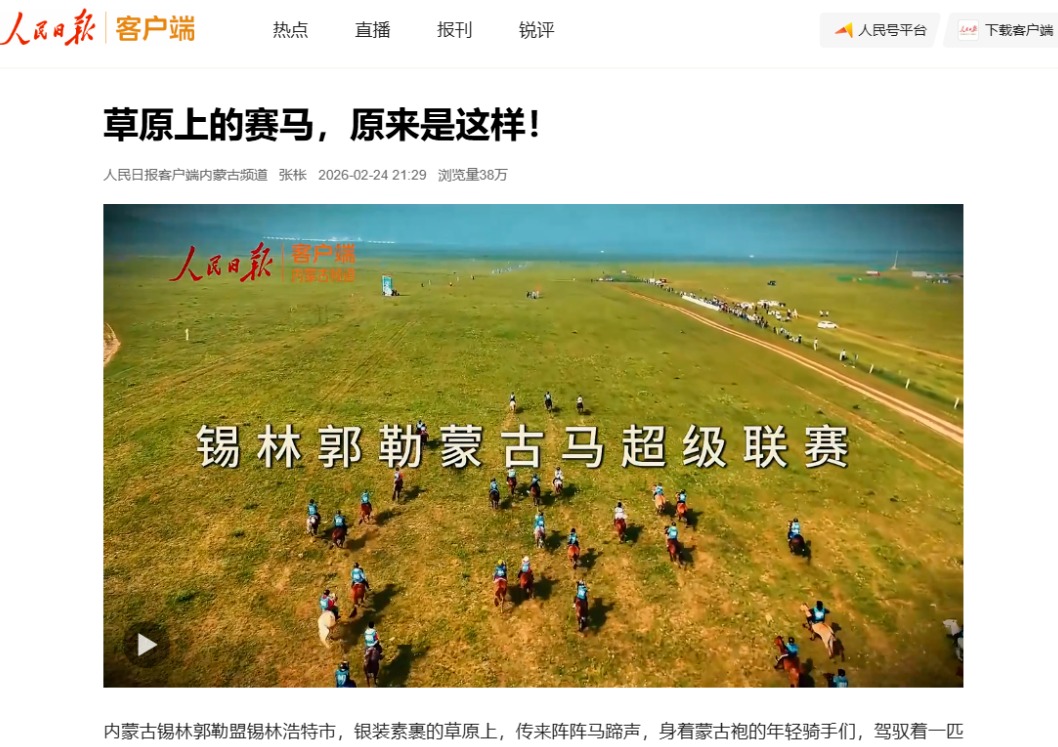 節(jié)后開(kāi)工首日,人民日?qǐng)?bào)客戶端發(fā)布《草原上的賽馬,原來(lái)是這樣!》,以四季馬超賽事為切入點(diǎn),聚焦騎手、游客的理解和體驗(yàn),全景式展現(xiàn)草原賽馬運(yùn)動(dòng)的前世今生和專業(yè)賽事正規(guī)化的發(fā)展歷程。